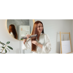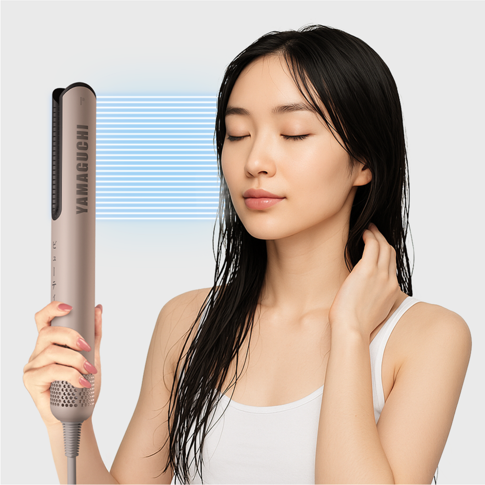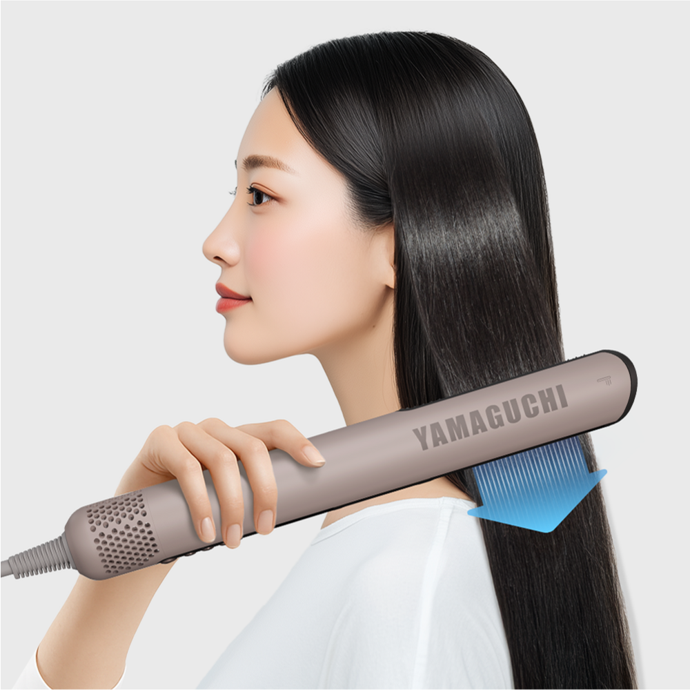 Фен-выпрямитель сочетает в себе передовые технологии укладки и бережного выпрямления волос. Мощный направленный поток создает зону низкого давления, мягко «затягивая» пряди в воздушную прослойку между пластинами. Волосы свободно парят в потоке нагретого воздуха, который ускоряет испарение влаги и одновременно разглаживает кутикулу за счет оптимального натяжения прядей. В отличие от обычных выпрямителей, фен бережно ухаживает за волосами, от корней до кончиков делая их гладкими и послушными, как после салонного ламинирования.